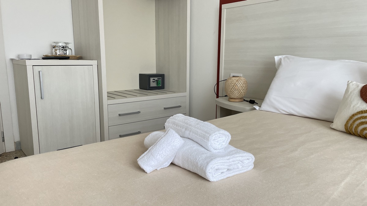 Unsere Zimmer mit Balkon fügen dem Komfort des Standardzimmers einen angenehmen Touch hinzu. Ihr Blick auf die ruhige private Straße ermöglicht die Nutzung eines großen Balkons, von dem aus Sie den Blick auf den Montiferru, die Salina Manna und die andere Seite der Bucht schweifen lassen können. Der Stil der Einrichtung, schlicht und elegant, verbindet sich mit dem Komfort und den notwendigen Ausstattungen, um den eigenen Urlaub in vollen Zügen zu genießen. Das Zimmer ist mit Sky Stream ausgestattet: Sport, Filme, Serien und internationale Sender wie zu Hause, auch in der Originalsprache verfügbar. Alles, was Sie lieben – auch im Urlaub in Putzu Idu.